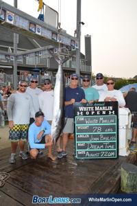 OCEAN CITY, Md. - It took a few days but there is finally a leader in the White Marlin category of the 41st Annual White Marlin Open. John Bayliss of North Carolina caught the 78-pound fish aboard the boat Dream Time. If Bayliss' lead holds, it'll be worth $1.1 Million dollars in prize money for the Dream Time crew.