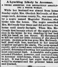The paper further added that Fletcher fled, but was later taken into custody by police and taken to the Accomack County Courthouse. The Shenandoah Herald released an article shortly after the lynching that said after Fletcher was caught, there were rumors circulating for several days that a lynch mob was forming.