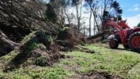 Heavy machinery removing fallen trees from Chris Patterson's front yard.