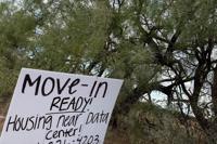 “AI WORKERS? HUGE DISCOUNTS” says one hand-made sign for "move-in ready" homes of one to six bedrooms.