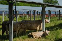 But beneath these panels is lush pasture instead of gravel, enjoyed by a small herd of cattle that spends its days munching grass and resting in the shade.