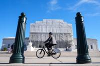 As a person on a bicycle rides past, construction on the front of the U.S. Supreme Court continues Monday, Nov. 24, 2025, in Washington.