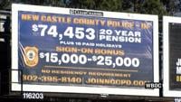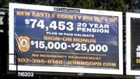 The New Castle County Police Department’s billboard highlights several incentives, including paid holidays, a signing bonus and a starting salary, all part of what local officials describe as an ongoing battle to recruit and retain officers.
