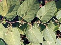 Japanese knotweed is a fast-growing, herbaceous shrub with broad leaves and white flower-spiked clusters. First introduced in the late 1800s, knotweed thrives in disturbed areas and along stream banks. Once established, knotweed can spread rapidly, creating a blanket of growth that threatens native plant communities.