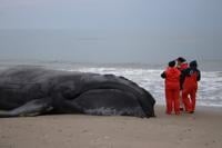 A dead North Atlantic right whale stranded on a barrier island off Virginia. The whale has been identified as a 3-year-old female, the 2023 calf of right whale #3293 “Porcia.” Credit: The Nature Conservancy, taken under NOAA permit #24359.