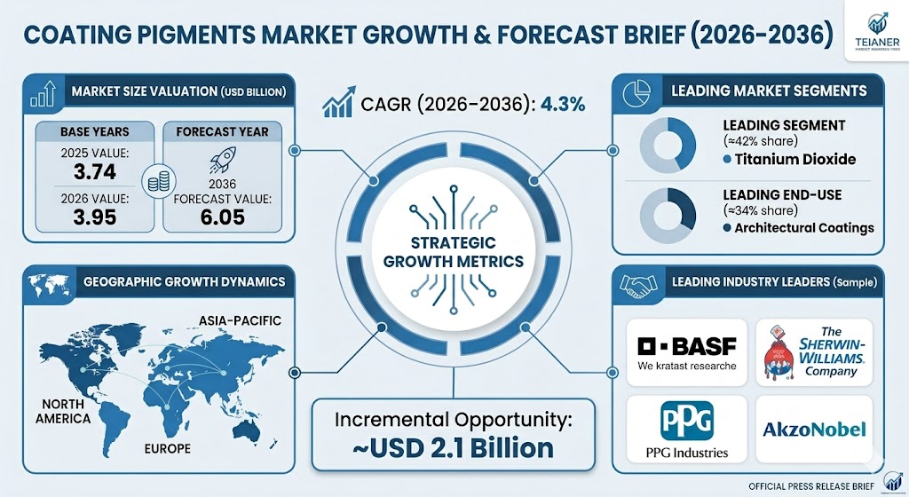 ROCKVILLE, MD, UNITED STATES, April 10, 2026 /EINPresswire.com/ -- According to Fact.MR’s latest analysis, the Germany coating pigments market is projected to reach USD 3.95 billion in 2026, up from USD 3.74 billion in 2025, and is forecast to surpass USD 6.05 billion by 2036, expanding at a CAGR of 4.3%. The market is expected to create an incremental opportunity of over USD 2.1 billion during the forecast period.
