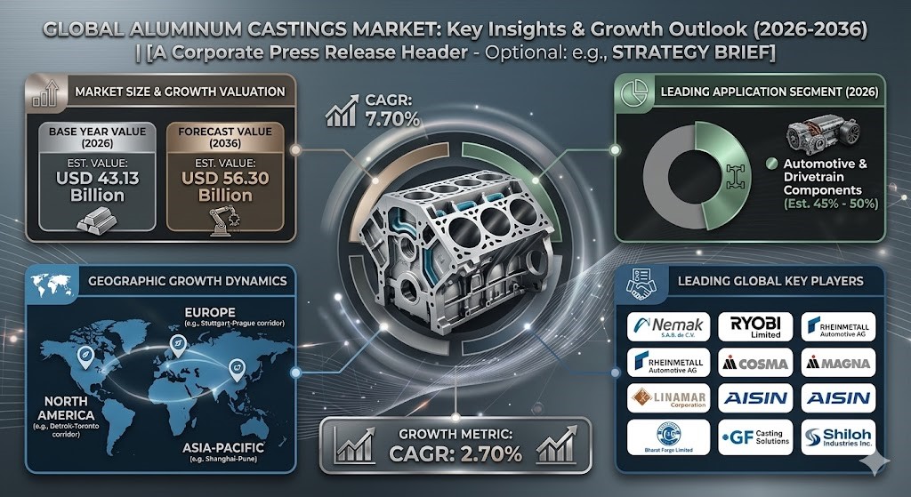 ROCKVILLE, MD, UNITED STATES, April 10, 2026 /EINPresswire.com/ -- According to Fact.MR’s latest analysis, the South Korea aluminum castings market is emerging as a technology-driven, precision-focused segment within the global landscape. Valued at an estimated USD 2.10 billion in 2025, the market is projected to reach USD 2.16 billion in 2026, and further expand to USD 2.77 billion by 2036, growing at a CAGR of 2.5%.