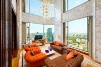 For connoisseurs of Italian interior artistry, the Designer Suite by Visionnaire in an elegant cream palette is the perfect choice. Spanning 126 square metres, it features the Esmeralda crystal chandelier and Excalibur lighting, a striking pair that creates a beautiful play of light. The marble-clad bathroom, glossy lacquered cabinetry, and sunflower-themed mosaic stretching from ceiling to floor elevate the suite's artistic appeal. A plush Oberon cream sofa invites guests to unwind while taking in sweeping city views.