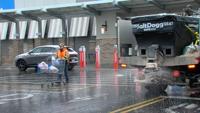 People gather on Washington Street in front of Manhattan Bridge during a snowfall, Sunday, Dec. 14, 2025, in the Brooklyn Borough of New York. (AP Photo/Adam Gray)