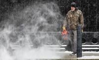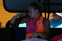 Aryna Sabalenka of Belarus blows cold air onto her face during her quarterfinal match against Iva Jovic of the U.S. at the Australian Open tennis championship in Melbourne, Australia, Tuesday, Jan. 27, 2026. (AP Photo/Dar Yasin)