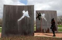 FILE - A visitor pauses as she visits the memorial "Landmark for Peace" commemorating the site where Robert Kennedy delivered his immortal words on the night of Martin Luther King Jr's assassination in Indianapolis, Wednesday, April 4, 2018. The park where Kennedy called for peace and unity just hours after the assassination of King is being designated a National Historic Site. (AP Photo/Michael Conroy, File)