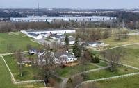 A stately southern mansion sits close to a proposed ICE detention center, top, in a small community in western Maryland known as a destination for weekend bicyclists and Civil War history buffs in Williamsport, Md., Thursday, March 26, 2026. (AP Photo/Steve Helber)