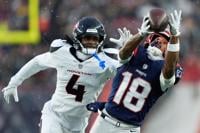 New England Patriots wide receiver Kyle Williams (18) cannot catch a pass against Houston Texans cornerback Kamari Lassiter (4) during the first half of an NFL divisional playoff football game, Sunday, Jan. 18, 2026, in Foxborough, Mass. (AP Photo/Robert F. Bukaty)