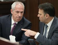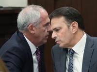 Defendant ex-FirstEnergy Senior Vice President Michael Dowling, left, talks to defense attorney George Stamboulidis during a hearing in Summit County Common Pleas Judge Susan Baker Ross' courtroom, in Akron, Ohio, Monday, March 30, 2026. (Mike Cardew/Akron Beacon Journal via AP, Pool)