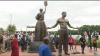 Artist Thomas Jay Warren's creation features two 12-foot bronze figures, one of a newly freed man with chains broken from his wrists, the other a woman holding an infant in one arm and in her other hand a page that reads “January 1” and the Roman numerals representing 1863, the date that Lincoln’s Emancipation Proclamation took effect.