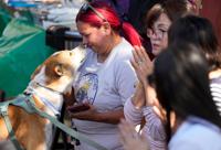 Mara Llorente pets Aloka a dog traveling with the Buddhist monks from the Huong Dao Vipassana Bhavana Center in Fort Worth, who are undertaking a 2,300 mile pilgrimage of "Walk for Peace," during a welcome ceremony at Hong Kong City Mall in Houston, Friday, Nov. 14, 2025. (Melissa Phillip/Houston Chronicle via AP)