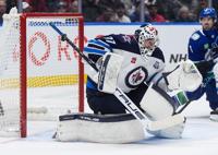 Winnipeg Jets goalie Connor Hellebuyck (37) makes a save with the shaft of his stick during the third period of an NHL hockey game against the Vancouver Canucks, in Vancouver, on Tuesday, Nov. 11, 2025. (Darryl Dyck/The Canadian Press via AP)
