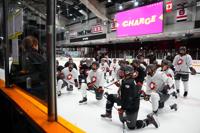 Ottawa Charge players huddle at the end of an on-ice session during PWHL hockey training camp, Wednesday, Nov. 12, 2025, in Ottawa, Ontario (Sean Kilpatrick/The Canadian Press via AP)