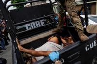 EDS NOTE: GRAPHIC CONTENT - A police officer stands over bloodied people lying in the back of a police truck brought to the Getulio Vargas Hospital during a police operation against alleged drug traffickers in the Complexo do Alemao favela where the criminal organization "Comando Vermelho" operates in Rio de Janeiro, Tuesday, Oct. 28, 2025. (AP Photo/Silvia Izquierdo)