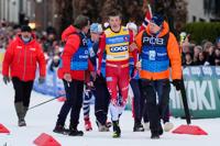 Norway's Johannes Hoesflot Klaebo walks after a fall during the World Cup sprint cross-country race in Drammen, Norway, Thursday March 12, 2026. (Lise Aserud/NTB Scanpix via AP)