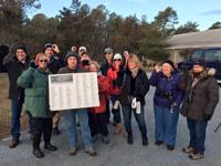 The Winter Delmarva Birding Group holds up a zero to represent an empty board before the trip.