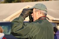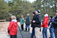 The group walks through Cape Henlopen State Park, stopping when they spot a bird.