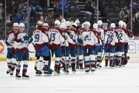 The Colorado Avalanche celebrate after beating the St. Louis Blues in an NHL hockey game, Tuesday, April 7, 2026, in St. Louis. (AP Photo/Joe Puetz)