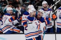 Edmonton Oilers center Connor McDavid (97) celebrates with teammates after scoring a goal during the first period of an NHL hockey game against the San Jose Sharks, Wednesday, April 8, 2026, in San Jose, Calif. (AP Photo/Godofredo A. Vásquez)