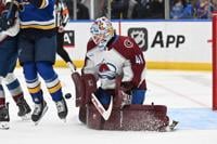 Colorado Avalanche goaltender Scott Wedgewood (41) blocks a shot from the St. Louis Blues during the second period of an NHL hockey game, Tuesday, April 7, 2026, in St. Louis. (AP Photo/Joe Puetz)