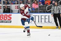 Colorado Avalanche's Josh Manson (42) takes a shot against the St. Louis Blues during the third period of an NHL hockey game, Tuesday, April 7, 2026, in St. Louis. (AP Photo/Joe Puetz)