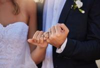 Wedding, rings and closeup of a couple with a pinky promise for love, loyalty and marriage. Romance, hands and married man and woman with jewe…