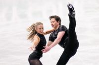 Piper Gilles and Paul Poirier from Canada perform during the ice dance rhythm dance at the Figure Skating World Championships in Prague, Czech Republic, Friday, March 27, 2026. (AP Photo/Petr David Josek)