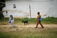 Paramedic Indra Kurniawan, right, carries a medical cooler containing measles vaccine as he walks with his colleague Fera Purnamasari during a house-to-house measles vaccination campaign following an outbreak in Sumenep on Madura Island, Indonesia, Monday, Sept. 8, 2025. (AP Photo/Dita Alangkara)