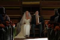 Emily Philbrook and Benjamin Barger hold a moment of silence during their traditional Quaker wedding at Arch Street Meeting House in Philadelphia on Oct. 3, 2025. (AP Photo/Luis Andres Henao)