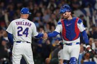 Chicago Cubs pitcher Caleb Thielbar (24) and catcher Carson Kelly (15) shake hands after Game 4 of baseball's National League Division Series against the Milwaukee Brewers Thursday, Oct. 9, 2025, in Chicago. (AP Photo/Nam Y. Huh)