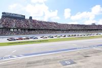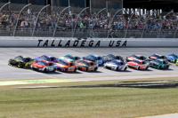 Tyler Reddick (45) and Kyle Larson (5) lead the pack to the start during a NASCAR Cup Series auto race, Sunday, April 26, 2026, in Talladega, Ala. (AP Photo/Butch Dill)