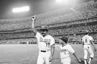 Los Angeles Dodgers Davey Lopes (15) signals to the crowd as he heads to the dugout on Tuesday, Oct. 10, 1978 in Los Angeles after hitting his second two-run home in the first game of the World Series. Youngster at right is Reggie Smith Jr. (AP Photo)