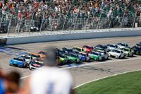Drivers head toward Turn 1 at the start of a NASCAR Cup Series auto race at Kansas Speedway in Kansas City, Kan., Sunday, Sept. 28, 2025. (AP Photo/Colin E. Braley)