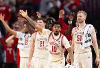 Nebraska's Jamarques Lawrence (10) and the Nebraska bench celebrate after Berke Büyüktuncel made a three-point shot during the second half of an NCAA college basketball game, Wednesday, Dec. 10, 2025, in Lincoln, Neb. (AP Photo/Rebecca S. Gratz)