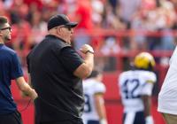 FILE - Michigan acting head coach Biff Poggi reacts after his team made a field goal against Nebraska during the first half of an NCAA college football game Saturday, Sept. 20, 2025, in Lincoln, Neb. (AP Photo/Rebecca S. Gratz, File)