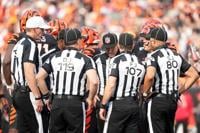 FILE - Referee Clay Martin (19), far left, talks with the officiating crew during an NFL football game between the Arizona Cardinals and the Cincinnati Bengals, Sunday, Dec. 28, 2025, in Cincinnati. (AP Photo/Kareem Elgazzar, file)