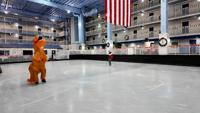 DelmarvaLife's James McDonald is getting an ice skating lesson from a friendly dinosaur at the Carousel Oceanfront Resort.