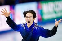 Yuma Kagiyama from Japan reacts at the end of his routine during the men free skating at the Figure Skating World Championships in Prague, Czech Republic, Saturday, March 28, 2026. (AP Photo/Petr David Josek)