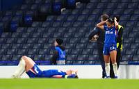 Chelsea's Alyssa Thompson, right, and a teammate react following defeat in the Women's Champions League quarterfinal second leg soccer match against Arsenal in London, Wednesday, April 1, 2026. (John Walton/PA via AP)