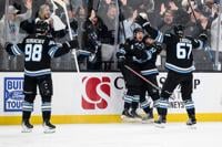 Utah Mammoth right wing Clayton Keller, center left, reacts to scoring a goal with teammates Utah Mammoth defenseman MacKenzie Weegar, center right, Utah Mammoth left wing Lawson Crouse, right, and Utah Mammoth defenseman Mikhail Sergachev, left, during the third period of Game 4 of a first-round NHL hockey Stanley Cup playoff series, Monday, April 27, 2026, in Salt Lake City. (AP Photo/Tyler Tate)