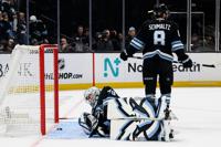 Utah Mammoth goaltender Karel Vejmelka, bottom, lays on the ice looking at the puck after giving up the winning goal during the overtime period of Game 4 of a first-round NHL hockey Stanley Cup playoff series against the Vegas Golden Knights, Monday, April 27, 2026, in Salt Lake City. (AP Photo/Tyler Tate)