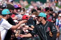 Arizona Diamondbacks' Nolan Arenado signs autographs prior to a spring training baseball game against the Los Angeles Angels Saturday, Feb. 28, 2026, in Tempe, Ariz. (AP Photo/Ross D. Franklin)