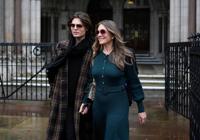 Elizabeth Hurley, right, leaves the Royal Courts of Justice on day four of the trial over allegations of unlawful information gathering brought against Associated Newspapers Limited, Thursday, Jan. 22, 2026, in London. (Jordan Pettitt/PA via AP)