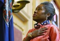 Virginia Lt. Gov. Winsome Earle-Sears pledges allegiance as she presides at the Capitol Monday Jan. 17, 2022, in Richmond, Va. (AP Photo/Steve…