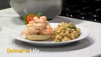 Joe White from Captain's Galley Crab Cake Shack is in the Kitchen Concepts Kitchen making shrimp salad.